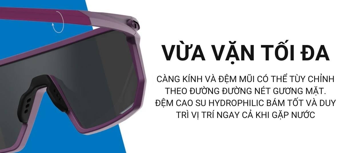 Đặc điểm: Thiết kế shield, miếng đệm mũi & gọng tai có thể điều chỉnh hoàn toàn; cao su ưa nước (hydrophilic rubber) tăng độ bám khi ra mồ hôi